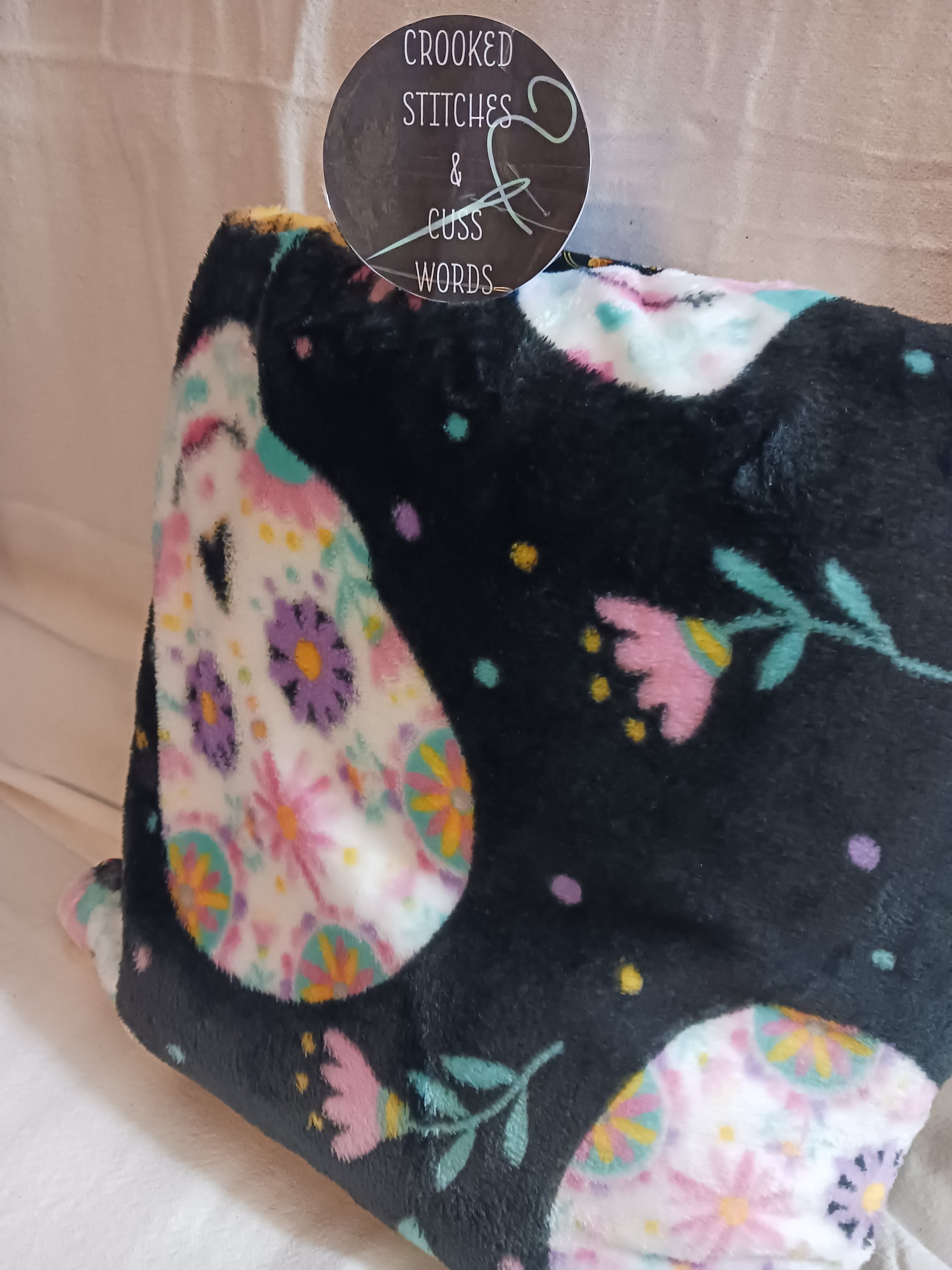 The Dia De Los Muertos Planket is a 50"x60" throw blanket that conveniently folds into a pillow, showcasing a lively Dia De Los Muertos design. Made from a blend of new, upcycled, and thrifted materials, it features a practical foot pocket for added comfort in Planket mode. This machine-washable item is perfect for small living spaces, remote work, gaming sessions, dorm rooms, camping, and travel. Designed solely as a blanket and pillow, it is not intended to be worn as a hooded garment. Enjoy a unique, eco-conscious accessory that combines style and functionality.