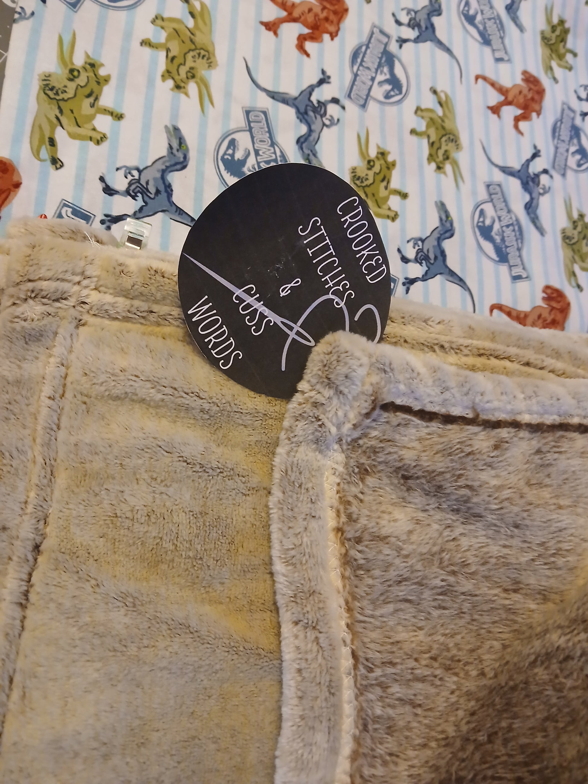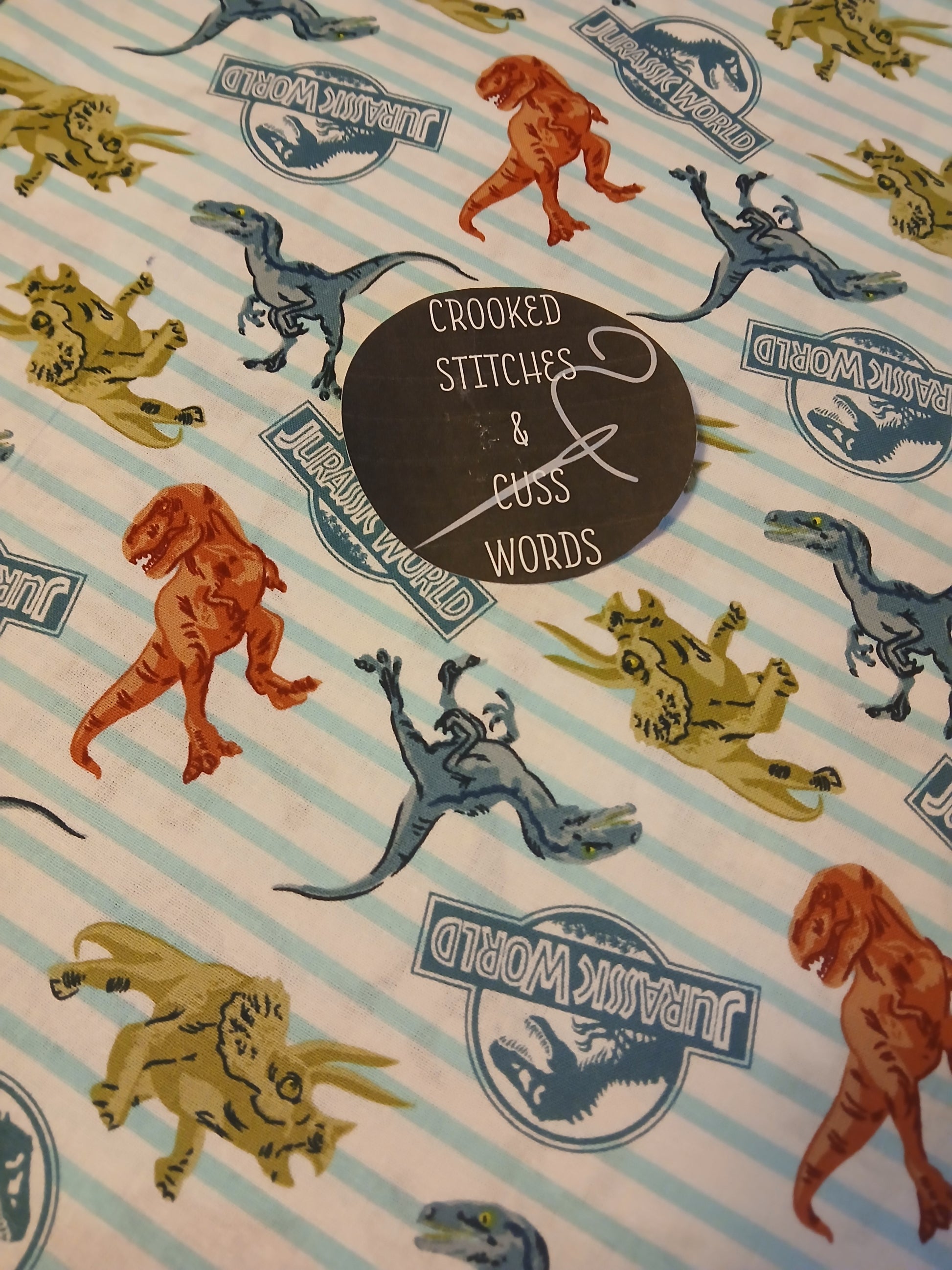 "Say "goodbye" to restless nights with the Dino-snore Planket! This 50"x60" throw blanket is not only fun with its Jurassic World print, but also functional - it easily folds into a comfy pillow and features a foot pocket. Made from new, upcycled and thrifted materials, it's machine-washable, perfect for insomnia extinction. Just remember, it's not a hooded garment!"